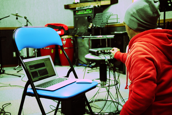 あんまり複雑なマイキングをしても収集がつかなくなるのは目に見えているので、シンプルにスネア、バスドラ、オーバーヘッドの3マイクセッティング。スネアとバスドラはSM58、オーバーヘッドはAKGのC2000B。