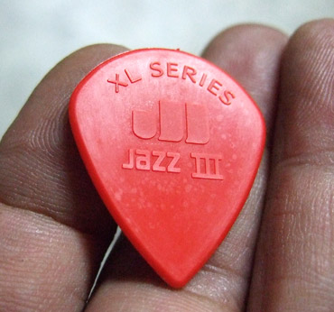 ここ数年はJIM DUNLOPの亀のデザインの黄色いやつを使ってました。(製品名がわからん…)特に不満は無いのですが、ちょっと気分を変えてみようかなっていう軽い気持ちです。形状的にはさほど差はないですが、材質と厚みがずいぶん違います。こちらのほうが厚いしプラスチッキー。JAZZⅢ自体の評判は悪くないですよね。