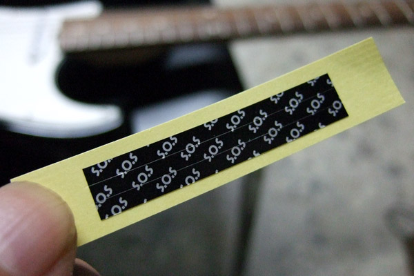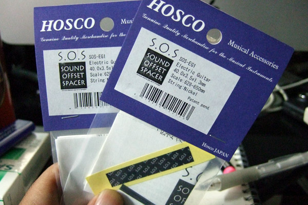 このパーツは弦のテンションで固定するのですが、最初ノーマルの状態で付けてみるとなんだか緩くて心許ない。メーカー曰く、そんな時はナットの溝を少し削るかスペーサーを利用しろということです。さすがにナットを削る勇気はありませんので、同梱されているスペーサーを利用。