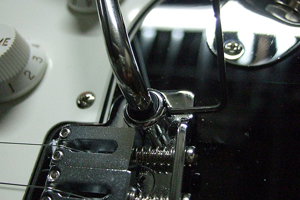 特別変わったことはしてませんが、フローティングの量を増量。よく耳にする事もあるかと思いますが、フルにアームアップで1音半アップを目安に。弦振動をボディに伝えるという意味ではベタ付けのほうが有利なんだろうけど、シンクロタイプでアームを使う場合ベタ付けはどうしてもチューニングを安定させるのが難しい。