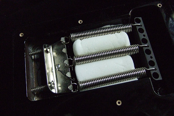 ところで今までスプリングの鳴り防止対策なんてやったことは無かったんですが、このギターで初めてやりました。と言うのも、これまで使ってきたギターではあり得なかったぐらい共振するんですわ。しかもあまり気持ち良くない鳴り方。ストラトのサウンドはスプリングの鳴りも含めてストラトのサウンドだっていう考え方もあるんでしょうが、どうにも気持ち悪くて…。