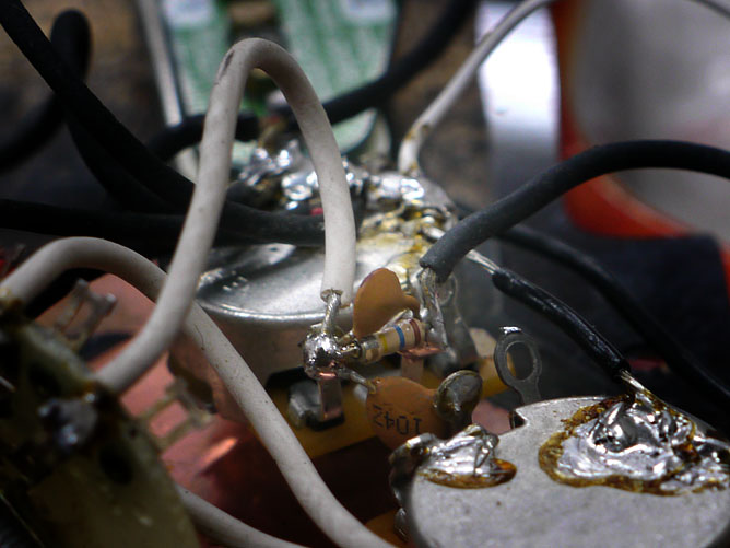 ところでこのギターが手元に来てから初めてピックガードをめくった時、ちょっと驚愕したのがハンダ付け。自分もかなり下手ですけどその自分をもってしてもちょっと許しがたいてんこ盛り状態。